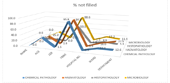 Accurate Laboratory diagnosis begins with proper and adequate filling of patient’s laboratory request form by the physician or the nurse. It is in line with this reality that the International Organization for Standardization [7] for Medical Laboratories states that the laboratory test request form should contain sufficient information to identify the patient, the authorized requester as well as significant clinical information. This study was carried out to assess the level of incomplete data on the laboratory request forms sent to Haematology, Chemical Pathology, Medical Microbiology and Histopathology Department of the Jos University Teaching hospital, Plateau, Nigeria. The data revealed that of all the 4310 request form distributed, none is 100% completely filled; either one parameter is missing or the other. The study also reveals that of all the 4,310 laboratory forms assessed; only the name of the patients was completely filled in all the forms.