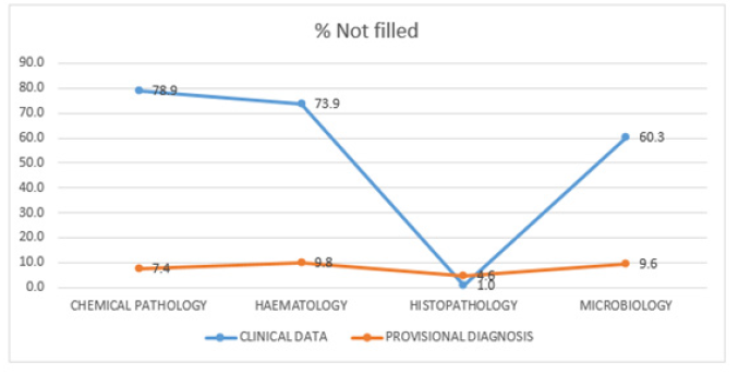 Results: The result of the findings revealed that from the 4310 request forms assessed, patient’ demographic information, recorded 20.9%, 17.2%, 14.9%, 1.3%, 0.9% and 0.0% incomplete rate for age, ward, department, hospital number, sex and name of the patient respectively. Patients’ clinical information revealed 54.7% and 8.0% incomplete rate for patients’ clinical data and provisional diagnosis respectively. For Clinician information, incomplete rate of 54.7%, 17.8% and 8.2% was recorded for signature of the doctor, name of doctor and the consultant respectively. On specimen information, an incomplete rate of 98.2%, 9.0%, 7.6% and 2.9% was observed for time of specimen collection, date, nature of specimen and investigation required respectively. On targeted laboratory, the study recorded an incomplete rate of 8.6%. The result also show that from all the 4310 request form assessed, none is 100% completely filled.