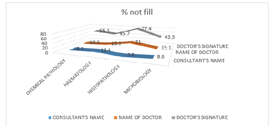 For the result on clinical information, clinical data shows an incomplete rate of 60%, 1%, 74%, and 79% in Medical Microbiology, Histopathology, Haematology and Chemical Pathology Laboratory respectively. Provisional Diagnosis showed an incomplete rate of 10%, 4.6%, 10 and 7% for Microbiology, Histopathology, Haematology and Chemical Pathology Laboratory respectively Figure 2. The Table also shows the incompletion rate of patients’ clinician information in the request form. On Consultant’s name, the result revealed an incomplete rate of 9% in Microbiology Laboratory, 2.8% in Histopathology Laboratory, 12% in Haematology laboratory and 8% in Chemical pathology Laboratory. On the Incompletion rate of the name of doctor, the table shows an incomplete rate of 15%, 31%, 15% and 11% for Microbiology, Histopathology, Haematology and Chemical Pathology Laboratory respectively. Signature of the Doctor recorded 43% in Microbiology Laboratory, 73% in Histopathology, 48% in Haematology laboratory and 55% in Chemical Pathology Laboratory. On specimen information, the result on the table shows an incomplete rate of 8% for the nature of specimen in Microbiology laboratory, 2% in histopathology, 11% in Haematology laboratory, and 8% in Chemical Pathology Laboratory (Figure 3) .