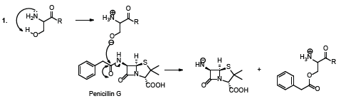 It has been reported that hydrolytic enzymes such as penicillin acylase, isolated from d’Echerichia coli, is able to catalyze the hydrolysis of natural penicillin to produce 6-aminopenicillanic acid. This acid is an important intermediate in the semi-synthetic preparation of antibiotics [1-7]. Experimental observations and structural studies of the enzyme showed that the serine hydroxyl group is transformed into an ester group (Scheme 1A ) [1-7]. In other words, the serine hydroxyl group, in the enzyme active center, acts as a nucleophile and the enzyme is regenerated by the nucleophile attack on the serine acyl intermediate or acyl enzyme (Scheme 1B).