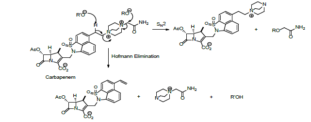 Carbapenems are β-lactam antibiotics possessing a very large activity against bacteria and a very high resistance to most β-lactam because of their chemical structures [1-41]. Therefore, they belong to the category of antibiotics used in the first line during severe nosocomial infections [10-50]. These kinds of antibiotics were developed from carbapenem thienamycin, a natural product derived from Streptomyces cattleya [10-50] Experimental observations showed that the structure of carbapenem decomposes by Hofmann degradation or nucleophilic substitution reaction (SN2) (Scheme 4) [10-50].