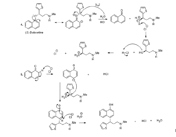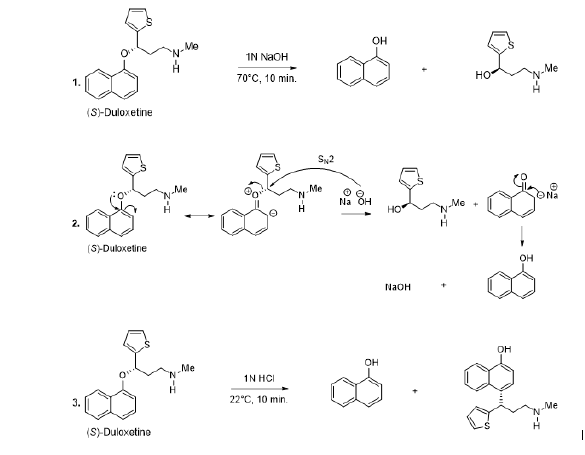 Duloxetine is a solid organic substance slightly soluble into water. This medicine is used to treat the depression and generalized anxiety disorder. It can be used to relieve urinary incontinence. The stability of this medicine depends on the storage conditions, chemical properties, and its impurities. In that perspective, experimental observation showed the disintegration of duloxetine, under alkaline conditions, to corresponding products as naphthol [51]. The plausible mechanism to explain the disintegration products involves the electronic doublet of the duloxetine oxygen atom. In other words, the delocalisation of the electronic doublet of the oxygen atom leads to the generation of two forms of resonance. The action of the base upon the ionic intermediate compound facilitates the disintegration of the medicine and a water molecule permits the formation of naphthol (Scheme 6, reaction 2). On the other hand, it has been observed that under acidic conditions, the degradation product is not naphthol (Scheme 6 6, reaction 5) [51].