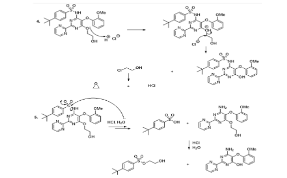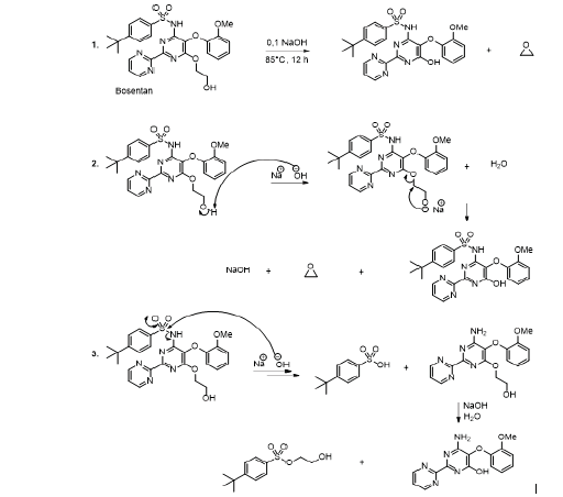 In the acidic conditions however, the hydrolysis begins by the protonation of the ether oxygen. This step is followed by the chloride ion nucleophilic attack to generate phenol and 2-chloroethanol. The latter can spontaneously cyclize to produce the epoxide and hydrochloric acid (Scheme 7, reaction 3). The amide bond was also hydrolyzed in alkaline medium as well as in acidic environment (Scheme 7, reaction 3). The authors observed also that the oxidation of bosentan by hydrogen peroxide (30 %) took place for 24 hours at the room temperature, and it produced identical compounds as in the case of hydrolysis conditions. This kind of chemical behavior of bosentan was explained by the acidic character of hydrogen peroxide (Scheme 7). It was observed that this medicine is stable in water [56].
