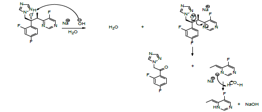 Voriconazole is a broad-spectrum fungicidal medicine. The study on the chemical stability showed that voriconazole is relatively stable in the solid form but instable when it is dissolved in alkaline medium or in the presence of an oxidant. The formation of the degradation products involves the removal of the tertiary alcohol proton by the base to produce an ionic adduct. The latter decomposes to generate the corresponding ketone and ionic aryl alkene. The action of a molecule of water upon the aryl anion alkene promotes the formation aryl alkene, and the regeneration of sodium hydroxyl (Scheme 9) [58].