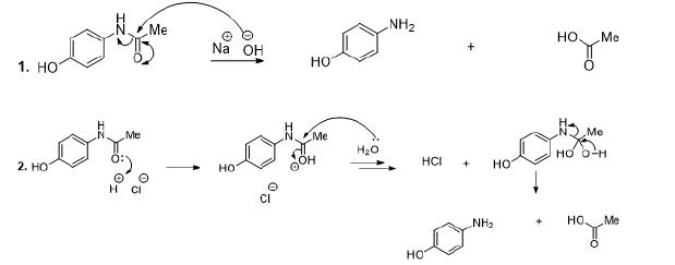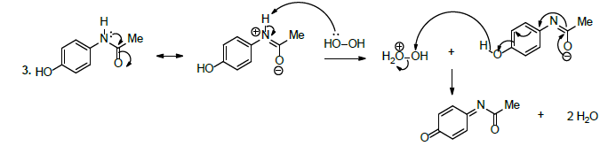 Therapeutically, paracetamol is a medicine utilised to relieve pain and inflammations.59 In this perspective, it is usually used to relieve headaches and it is incorporated as main ingredient into various flu medications. The disintegration study revealed that paracetamol decomposes substantially under alkaline conditions (Scheme 10, reaction 1), acidic (Scheme 10, reaction 2), and in the presence of hydrogen peroxide (Scheme 10, reaction 3) [59].