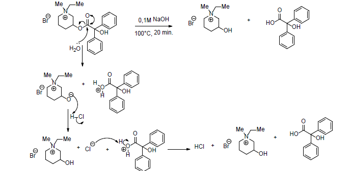 Pipenzolate bromide is an organic substance with a quaternary ammonium center. From medical point of view, pipenzolate bromide is an anti-muscarinic medicine useful in the treatment of overactive bladder. The chemical structure shows that pipenzolate bromide is an ester typical medicine. Consequently, it is sensible to the hydrolysis catalyzed by an acid or base, and the fragmentation products are identical in the acidic hydrolysis or base hydrolysis (Scheme 11) [60].