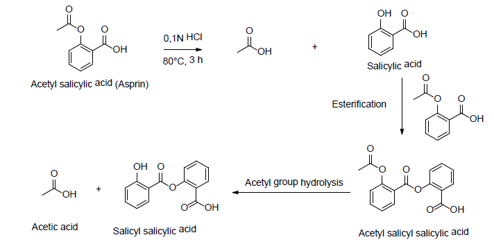 Aspirin is a medicine used as an analgesic, against inflammation, and as antipyretic. It is also used to prevent cardiovascular diseases. Structurally speaking, aspirin is an organic compound containing an ester group. That is why, it is sensible to hydrolysis and oxidation conditions. It has been observed that when aspirin is dissolved in aqueous solution containing 0,1N HCl or 0,1N NaOH, it decomposes to corresponding acids (Scheme 12).