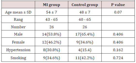 (Table 1) 52 patients were included in the study, 26 patients with acute MI (case group) and 26 patients without MI (control group). There is significant difference in mean age between case group and control group (P 0.07). There is no significant difference in the distribution and frequency of hypertension among groups. All smoker was male without significant difference among groups.