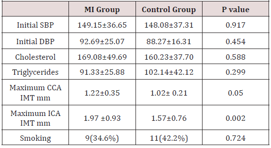(Table 2) Mean maximum IMT of the CCA and ICA were significantly higher in MI group than control group (P= 0.05, P=0.002 respectively.