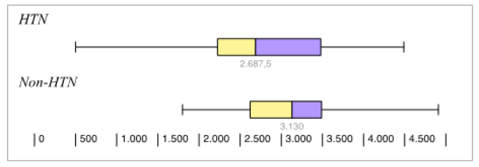 Thirteen participants were lost to follow up (8 cases and 5 controls). Among those remaining (74 cases and 77 controls), there was a statistically significant difference in the birth weight and APGAR scores (at 1 and 5 minutes); which were lower among the new-borns of the hypertensive group 2661g, 8.2, 9.1) than as compared to their controls (3082g, 8.8, 9.9) (Figure 1), (Figure 2), (Figure 3)