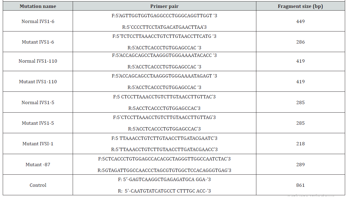 PCR was performed using the primers described by[7]. The nucleotide substitution in the primers was focused on nucleotide position of IVSI-6 and IVSI-110. Primer nucleotide sequences, the primer combination for each reaction and amplification product length are listed in (Table 1). For each reaction, 5 μl PCR master mix (Solis Bio dyne master mix), 8 μl deionized water, 5 μl DNA template and 0.5 μl of each allele specific primers in one micro-tube were mixed. PCR was performed in a thermal cycler (Techne, UK). In the first reaction, IVSI-6 (T→C) primer pair was used to amplify the 449 bp fragment to detect the normal alleles. The IVSI-6 (T→C) mutant primer pair in the second reaction was selected to amplify the 286 bp fragment for mutant allele detection. In the third reaction, the IVSI-110 (G→A) primer pair was selected to amplify the 419 bp product to detect normal DNA sequence at this point. Finally, in the fourth reaction, the mutant IVSI-110 (G→A) primer pair was applied to produce the 419 bp fragment to detect the point mutation at this position. In each PCR, specific primers were used as internal positive control that produces a 861 bp. The cycling conditions were an initial denaturation for 3 min at 95°C, followed by 35 cycles of 60 sec at 94°C, 60 sec at 60°C, 90sec at 72°C and an additional 3 min at 72°C for final extension. 5 μl of the PCR product was analyzed by gel electrophoresis [7].