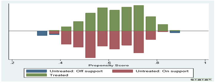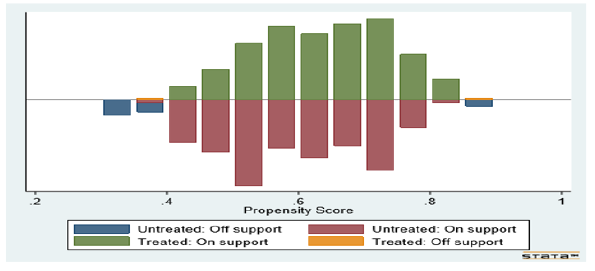 Figure 1 and 2 show a visual presentation of density distributions of the estimated propensity scores for the two groups. These histograms illustrate the number of smallholder farmers’ who are on fertilizer subsidy programme support and those off support. The common support condition is satisfied. There is an overlap in the distribution of the propensity score of both participants (treated) group and non- participants (untreated) group. The upper halves of the histograms show the propensity score distribution for the participants while the bottom halves refer to that of the nonparticipants [31-33] (Figure 1&2s).