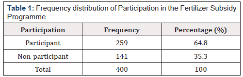 Under this study participation is when a farmer buys the fertilizer at a subsidized price, non-participation is when a farmer buys at commercial market price. However, in the case of the subsidy programme, it is universal in nature and every farmer has the chance of participating or not. From Table 1, the results revealed that, those who participated in the fertiliser at the subsidised rate among farmers constitute 259 (64.8%) while the remaining 141 (35.3%) did not participate in subsidised fertiliser rate. The high level of participation among farmers can partly be due to the lower cost involves in securing subsidized fertilizer as compared to commercial rates. According [8], farmers in developing countries usually preferred agricultural input to be subsidized for easy accessibility, due to their poor economic status (Table 1).
