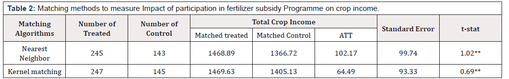 Table 2:Matching methods to measure Impact of participation in fertilizer subsidy Programme on crop income.