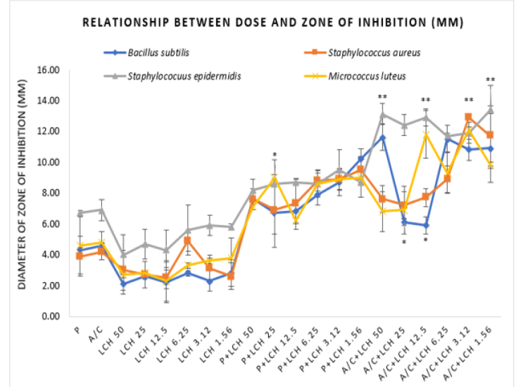 (Figure 1) shows that penicillin and amoxicillin-clavulanic acid exhibit mild antibacterial effect against the tested bacteria. Honey alone at the applied doses could not produce significant efficacy against any of the bacteria. However, when used in combination with the standard drugs, LCH demonstrated greater potency developing zone of inhibitions (Figure 1).