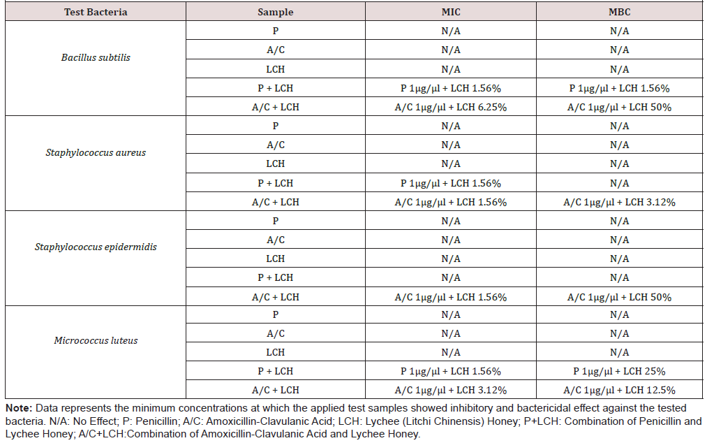 Demonstrated that any of the applied doses for the honey alone was not able to produce bacteriostatic or bactericidal effect. The same was observed for penicillin and amoxiclav when tested individually. However, the combinations with honey showed the potency. Penicillin with the lowest applied dose of lychee honey (1.56%) was able to produce both bacteriostatic and bactericidal effect against B. subtilis and bacteriostatic effect against S. aureus and M. luteus. But it could not produce any effect against S. epidermidis. On the other hand, amoxiclav at different doses exhibited its inhibitory as well as killing potential against all tested organisms.