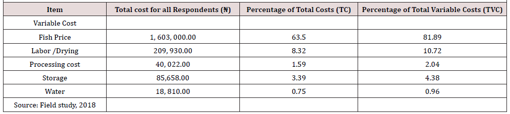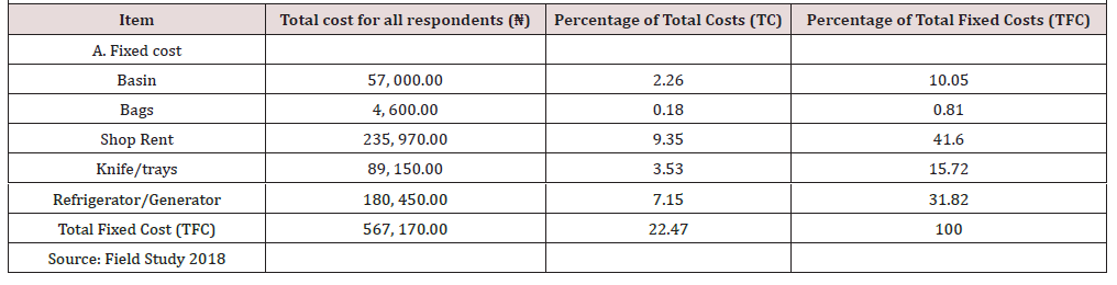 Budgetary analysis of fixed cost of dried fish air sac marketing shows that shop rent takes 41.60% and 9.35% of the Total Fixed Cost (TFC) and Total Cost (TC) respectively. This is expected because field studies reveal that average monthly rent of a shop was between N7000-N10000. The high cost of rented shops in this area is not unconnected with the smuggling business around this area as most of the shops were used as warehouses for the smuggled goods. Refrigerator/generator constitutes 7.15% of the total costs and 31.82% of the Total Fixed Cost (TFC) respectively. Knife and trays constitute 3.53% and 15.72% of the total cost e total fixed cost respectively. Basin constitute 2.26% of total cost and 10.05% of the Total Fixed Cost (TC) respectively while bags constitute 0.18% of total cost and 0.81% of the Total Fixed Cost (TC) respectively. The study reveals that fixed cost of N567,170.00 is only 22.47% of the total cost of marketing of the dried fish’s air sac in the study area. This invariably means that in dried fish air sac marketing, the budgetary fixed cost is about one quarter (1/4) of the total budgetary cost of it (Table 3)(Table 3).