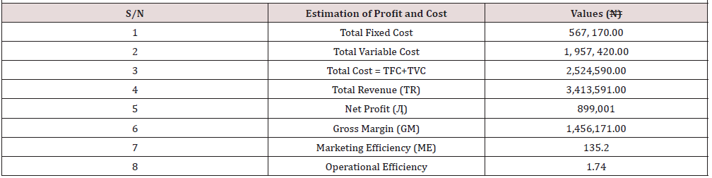 (Table 3) shows the profitability of dried fish air sac marketing ascertained using budgetary analysis. The total cost of marketing dried fish air sac during the period of the study was ₦2, 524, 590.00 and the total revenue of ₦3, 413, 591.00 was realized; hence a net profit of N889, 001.00 was realized from sales of dried fish air sac by the marketers between the periods. The net profit shows that dried fish air sac marketing in the study area was profitable. The finding agrees with Oyieng et al. [5] who reported that fish marketing is a profitable enterprise in Akwa Ibom State. Oyieng et al. [5] also reported that dried fish trading is a significant economic livelihood of people in the rain forest and derived savanna ecological zones of Nigeria. The marketing efficiency of dried fish air sac marketing in the study area was 135.2 and operationally 1.74 as shown in Table 4. This implies that dried fish air sac market in the study area was efficient [6, 7, 8, 9, 10, 11, 12, 13, 14, 15].