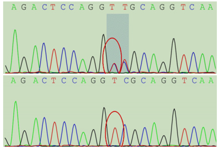 Note: The red circle shows the mutation position of c.884A > G; A: c.884A > G mutation is detected in GFAP gene of child; B: c.884A > G mutation is detected in GFAP gene of father; C: c.884A > G mutation is not detected in GFAP gene of mother.