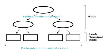 A tree is composed of numerous nodes as illustrated in (Figure 1). Tree estimation is in general based on recursively performing binary partitioning on the covariate space using some pre-defined splitting rule. The result is a collection of candidates ‘nodes’, starting from the top (single-node) of the tree to a number of terminal nodes or leafs [8]. RF is an ensemble of trees, hence the term forest, where the final prediction is averaged over all trees in the forest. Each tree is non-deterministic as the tree is grown on a subspace of individuals who were picked from bootstrapping the whole dataset [9]. Growing a single tree is well known to exhibit high variances in predicted outcomes. By combining the trees, however, variance as well as bias in prediction can be substantially decreased [10].