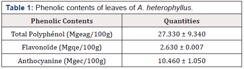 Phytochemical analysis performed by TLC showed the presence of phenolic compounds as major compounds. These phenolic compounds are responsible of antiradical activity of plants, since this potential is strongly attributed to them [12]. By comparing with the used standards, phenolic acids such as cafeic acid and chlorogenic acid are identified in the plant [13,14]. These results were like those previously described that indicate the presence of flavonoids in the leaves of A. heterophyllus [15]. Figure 2 shows the presence of coumarins (blue fluorescent spots) in almost all the extracts of the tested samples. Concerning anthraquinones, Figure 2 shows the presence of anthrones (red spots) [16,17]. The presence of anthocyanins was indicated in all extracts as described in the chromatogram of Figure 2. The analysis of Figure 2 shows the coloration observed in the chromatographic profiles of each sample (violet, orange) and indicates the presence of terpenes including irridoids in all extracts. These results were like those previously described by Prakash et al. and Sivagnanasundaram and Karunanayake [14-17] in A. heterophyllus [18] that indicated the presence of these chemical compounds in A. heterophyllus. The presence of these compounds in a plant species could confer some biological properties, such as antioxidant activity and anthelmintic activity [4]. The alkaloid test gave a negative response using Draggendorff reagent. The results of secondary metabolite assays are presented in Table 1 below