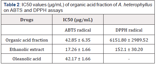 The antioxidant activity of tested extracts determined by ABTS and DPPH assays is presented in Table 2 and is expressed as IC50 values. IC50 is the amount of antioxidant necessary to decrease the initial concentration of radical by 50%. A lower IC50 value indicates a higher antioxidant activity. Oleanolic acid, organic acid fraction and ethanolic extract of A. heterophyllus showed less IC50 values inferior to 100 μg/mL in the ABTS test. For the DPPH test, the oleanolic acid and the organic acid fraction of A. heterophyllus seem to be inactive at tested concentrations. The capacities of various extracts to inhibit radicals vary substantially in each type of test. This difference may be due to the qualitative and/or quantitative range of secondary metabolites of the extracts. Furthermore, it should be noted that the IC50 value obtained in the ABTS test is interesting than that of the DPPH test. This difference in activity is attributed to the mechanisms of reactions. In fact, the ABTS radical reacts with hydrophilic and lipophilic compounds at the same time while DPPH° radical reacts only with hydrophilic compounds [10]. A lower IC50 value of A. heterophyllus indicates a higher antioxidant activity. To our knowledge, it is for the first time that the antioxidant activity of the organic acid fraction of the leaves of A. heterophyllus is reported.