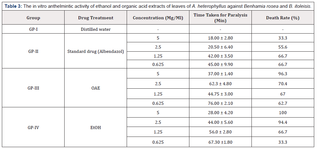 Table 3:The in vitro anthelmintic activity of ethanol and organic acid extracts of leaves of A. heterophyllus against Benhamia rosea and B. itoleisis.