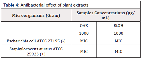The antibacterial avtivty of the leaves of A. heterophyllus is presented in the Table 4. The results of antibacterial activity showed E. coli and S. aureus are not sensitive to A. heterophyllus with the CMIs>1000 μ g/mL) This antibacterial activity is however weak (MIC>1000 μ g/mL) [30] and would be due to the presence of phenolic and triterpenic compounds present in the tested extracts. The bioactivity would be due to the nature of their wall [31]. Indeed, S. aureus is a positive gram bacterium. Its wall is thick (several layers) and would be the pharmacological target of the biologically active compounds present in A. heterophyllus leaves. These results corroborate with studies on the antimicrobial properties of the secondary metabolites of plant origin [32,33].