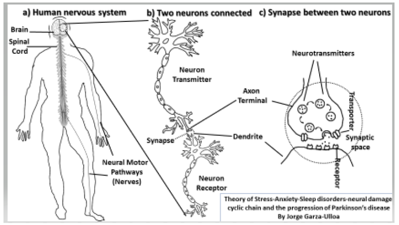 It is very important to understand the concepts of how the “human nervous system”, “neurons”, “neural pathways”, “synapses” and “neurotransmitters” work together in the human body, to find the relation of many neurologic diseases as: Parkinson’s disease, Multiple System Atrophy, Lewy body dementia (Lewy bodies), Alzheimer’s disease, Huntington’s disease, and others. They could make use of the proposed cyclic chain “Stress-Anxiety-Sleep disorders, Neural damage” for their progression. The concepts can be explained as follow [7]: