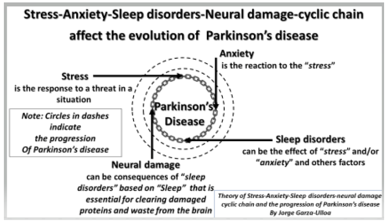 “The Theory of Stress-Anxiety-Sleep Disorders-Neural Damage cyclic chain and the progression of Parkinson’s disease “, it is explained with concept involved, many reasons to be included in the theory and their relations to previous conclusions/suggestions of many researchers papers already publish, and recommendations to develop good habits in PD patients, with correct attitude and actions to implement the theory to help in the goal of achieve a decrease in the progression of Parkinson’s disease. They are concentrated as “The 7 most important recommendations for PD patients and their caregivers”