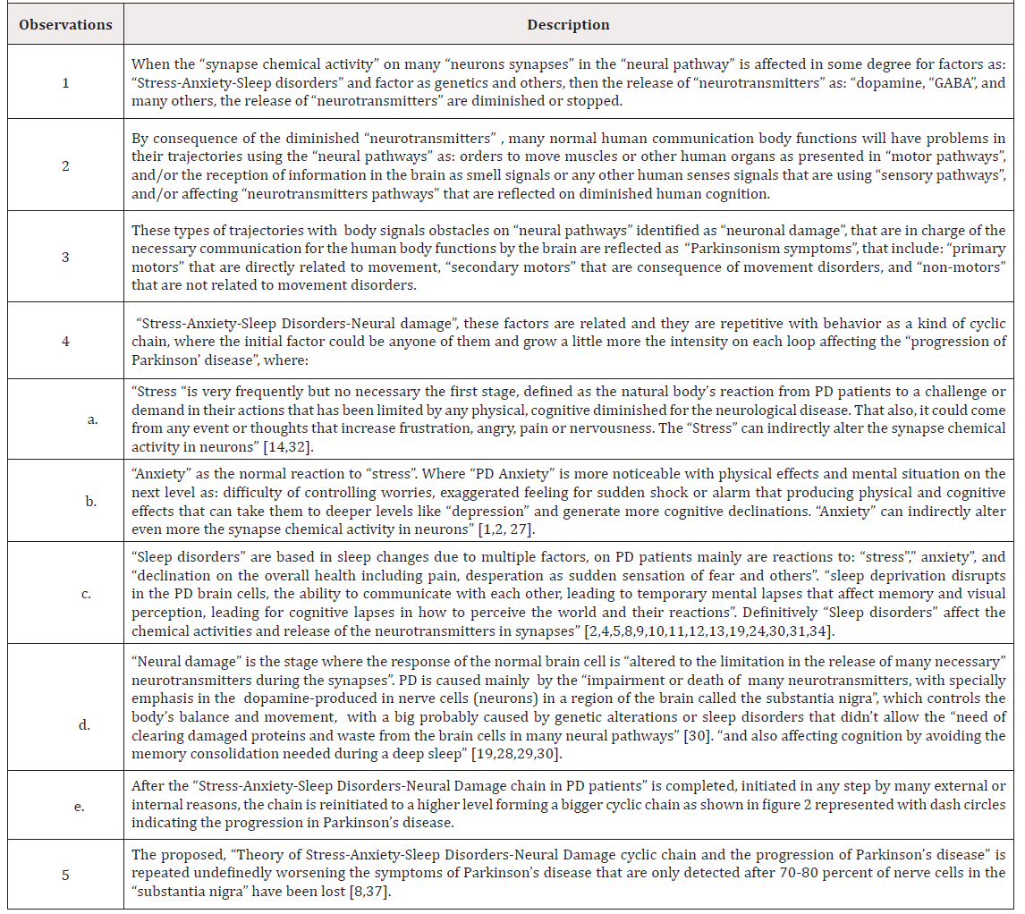 As mention and explain, hundreds of research publications around the world are obtaining more and more results to conclude or suggest in some way: “The Theory of Stress-Anxiety-Sleep disorders-neural damage cyclic chain and the progression of Parkinson’s disease” that can be explain as shown in (Table 2).