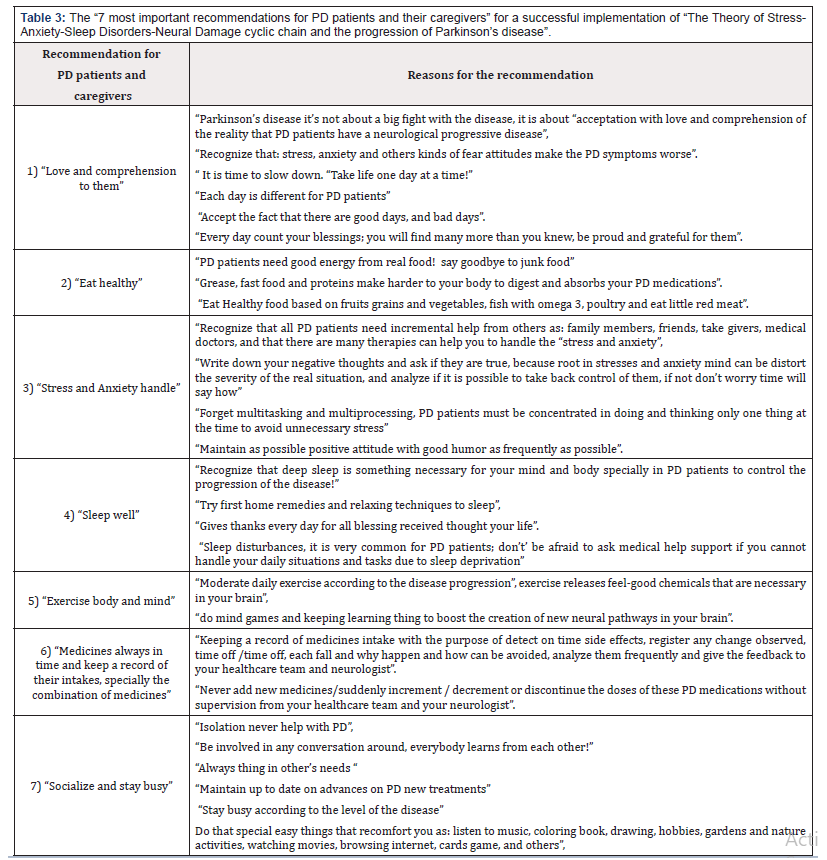 Based on “The Theory of Stress-Anxiety-Sleep Disorders-Neural Damage cyclic chain and the progression of Parkinson’s disease “ shown in Figure 2, explained in the last section, stated in Table 2, and taking into account that Parkinson’s doesn’t affect only the person diagnosed with the disease; it can impact loves ones, family members, friends and caregivers too. I can deduct the following “7 more important recommendations for PD patients and their caregivers” for a good implementation of the theory and achieve the decreased progression of this neurological disease. The basic recommendations are indicated in the following (Table 3).