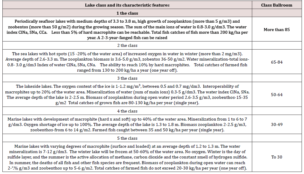 In view of the frequency of fluctuations in the level of lakes in the south of West Siberian Plain[10, 11], and the emerging natural conditions (factors) of the region, the zonal fisheries management of the region were developed and recommended by lake merchandise trade khozors of the region located in the steppe of the Priyshimsky Plain of the region of the lake. They provide a realistic assessment of the environmental and production capabilities of each particular lake of forest steppe Zauralye, which is used for the production of commercial fish in points [12] . Studies have found that all the wooded lakes of the Priishimsky Zauralye-type lake may be subdivided into five classes with their main characteristics (Table 1).