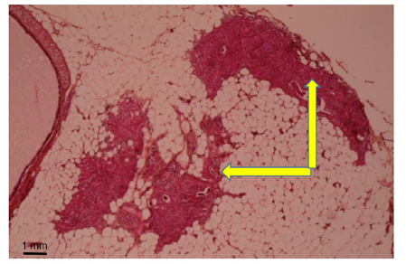 Figure 2: Month 3: Weak development of foetal heart implant (arrow) in mesenteric pouch (Hematoxylin eosin).