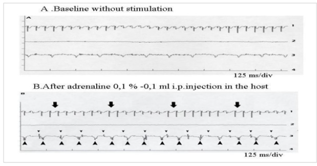 Figure 4A: Registration of electric activity and demonstration of the capacity of the implant to answer to neuro-humoral stimulations
