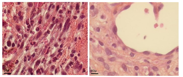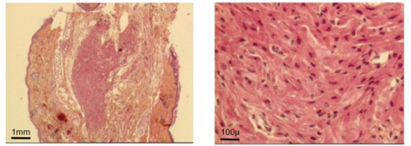 G. Histological investigation: after each animal death or euthanasia (by anesthetic overdose), that is at days 0, 2, 5, 7, 14, 21, 28, 42, 60 and at months 4, 6, 7-12, macroscopic and microscopic investigation of the transplantation area and main inner organs (lungs, liver, kidneys) was provided. Collected biopsy materials were fixed in neutral buffered formaldehyde 4% and embedded in paraffin. Three microns slices were stained by hematoxylin eosin and in some cases by trichrome green of Masson for microscopic evaluation. Electron microscopy of the grown graft was performed using 1.5% glutaraldehyde fixation and epon embedment.