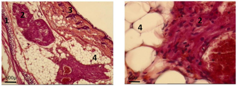 Figure 5G: At day 160: normal adult ultra-structure of fetal implant cardiomyocyte.Ear cartilage; 2. Implant; 3. Ear skin; 4. Adipose tissue