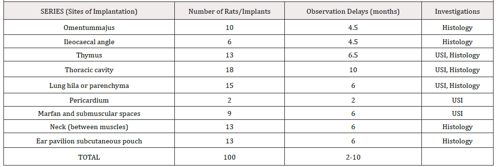 For intrathoracic implantation, after median longitudinal sternotomy, the FHI was placed either into the thymus capsule or into the lung hila’s under the visceral pleura. The incisions were shut by a 6°° Ethilon stich. The thoracic wall wound was then sutured layer by layer with classic separate stitches using Vicryl 2°° for sternum, 4°° for muscles and diaphragm (if necessary) and running suture 6°° for the skin.For intra-abdominal implantation, a longitudinal incision from sternum to pubis of the skin, the white line and the parietal peritoneum was performed. One or several FHI were inserted between the omentum sheets or into a loge managed under the visceral mesentery layer in the ileocaecal angle. Or in the spleen hilum An Ethylon 7°° stich closed the pouch. The peritoneal cavity was shut by a two-layer suture using 4 or 5°° Ethylon continuous suture.