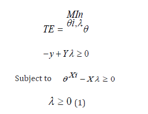 The empirical part of this study is based on Data Envelopment Analysis (DEA) to estimate changes in Technical Efficiency (TE), Scale Efficiency (SE), and Total Factor Productivity (TFP) in in Northern Thailand of Rice Production. The DEA concept is a non-parametric method to estimating efficiency that has been developed by [9] . The score is ranked from inefficiency score of 0.000 to efficiency score of 1.000. This technique is a useful research method not only to measure the efficiency of DMUs, but also to evaluate their relative efficiency. A cross-sectional data, panel data, and time-series data can be evaluated by this approach as well. DEA can be either used in output oriented form or input oriented form depending on the purpose of researcher. The input oriented DEA model seeks the maximum possible proportional decrease in input usage with a given output levels. Meanwhile, the output oriented DEA model seeks the maximum possible proportional increase in output with a given set of inputs. In this study, to evaluate the technical efficiency by adopting input-oriented DEA model. The input oriented DEA model can be measured by assuming a constant return to scale in this study mentioned as follows in equation 1 [10] .