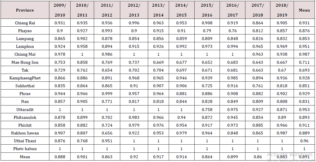 In table 2, it showed the results in the productivity trend of the wet season rice production during 2009–2019 by using the Malmquist Productivity Index (MPI). The Average of Efficiency Change (EC), Technological Change (TC), and Total Factor Productivity (TFP) change of wet season rice producing provinces in Northern Thailand were 0.997, 1.005 and 1.003, respectively. The findings indicated that, the TFP of wet season rice production in¬creased. Besides, for the decomposition effects of the MPI, wet season rice production has shown the technical progress and efficiency improve ¬ments when the years 2010 and 2019 are compared, except during of 2009–2010, 2011–2012, 2013–2014, 2014–2015, 2015– 2016 and 2017–2018, which have decreased in the production efficiency and techno¬logical progress (Table 2).
