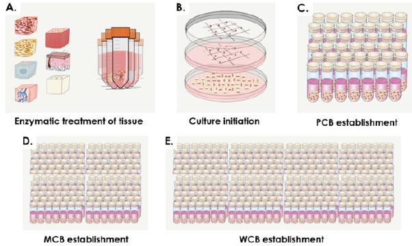 Figure 3: Fetal tissue bioprocessing and tiered progeny eFPC banking. A) Isolation of specific fetal tissues during micro-dissection and enzymatic treatment. B) Preliminary cell expansion after culture initiation. C) Establishment of Parental Cell Banks (PCBs, ̴ 40 vials/lot). D) Establishment of Master Cell Banks (MCBs, ̴ 150 vials/lot). E) Establishment of Working Cell Banks (WCBs, ̴ 300 vials/lot).