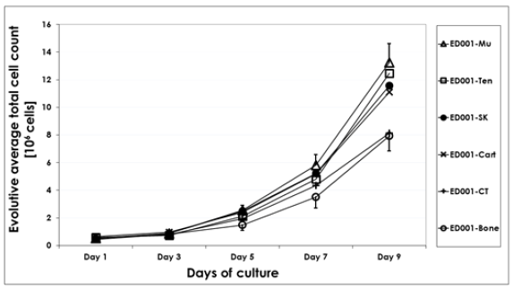 Figure 4: Growth curves representing comparative cell proliferation of eFPC cell types derived from equine fetal donations (skin, muscle, cartilage, bone, connective tissue and tendon biopsies). The average and evolutive total cell counts are presented as a function of time for cultures in T75 flasks. Data is presented for donor ED001 cell types at P4. Associated standard deviations of average counts are presented only for certain cell types as error bars to avoid overcrowding the data plots. Experiments were performed in triplicate and in three experimental repetitions.
