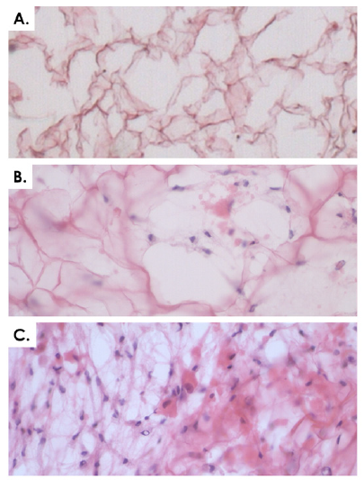 Figure 5: Cyto-compatibility of equine progenitor cells (ED001-SK) with collagen scaffolds. A) Equine Progenitor Biological Bandage without cells (control) after a two-week incubation period. B) Progenitor cells in the collagen scaffold after a two-week incubation period. C) Progenitor cells in the collagen scaffold after a four-week incubation period. Data was obtained using 20 μm sections stained with HE, imaged under 400X optical magnification.