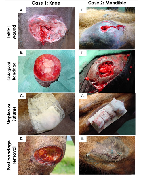 Figure 8: Case studies describing treatment of a distal limb profound injury and a mandibular fistula created by an abscessed tooth. A & E) Initial wound presentation before intervention. B & F) Application of biological constructs after thorough cleansing, disinfection and surgical debridement of the wounds. C & G) Suturing and stapling of wound coverage over the surgery sites. D & H) Bandage removal after three days (D) and nine days (H).