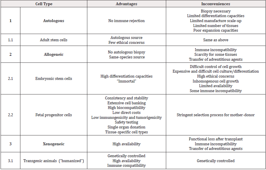 Cell therapy and tissue engineering developments are producing novel approaches with remarkable induction of biological functions and clinical effects, whereas therapeutic cell choice and processing thereof is of utmost importance. Fetal tissues have been invaluable investigational tools in embryology, developmental anatomy and physiology [31,46,58]. Fetal cells additionally benefit from extensive industrial use and hindsight in biotechnology and pharmaceutical fields, being key substrates for production of viral vaccines for diseases such as polio and rabies [41]. Associated tissues such as placenta, amnion, amniotic fluid, umbilical cord and cells derived thereof have also been investigated for the development of new therapeutic products [6,8,31,33,69,70]. Effective development and industrial transposition of cell therapy manufacture are highly dependent on the selected cell source, processing thereof and resulting intrinsic characteristics. In view of tangible widespread application, tissue engineering processes must meet stringent criteria such as safety, consistency, rapidity and reliability in order to remain effective and cost-effective [46,53,69]. Regulatory frameworks and classifications should also be taken into account in early phases of therapy or product development [71]. Table 1 lists and characterizes major cell sources of interest (including autologous, allogeneic and xenogeneic) for development of therapeutic strategies and products. Primary fetal progenitor cells isolated following standardized protocols possess numerous intrinsic technological advantages making them optimally suitable for regenerative medicine applications. Low technical culture requirements (simple and standardizable industrial processes), high proliferation rates and extensive expansion potential (i.e. > 10 in vitro passages with high PDVs) enable robust and tangible establishment of large consistent and characterized cell banks. Such cell stocks can potentially be relatively much larger than stem cell banks for example, whereas higher seeding densities (> 104 viable cells/cm2) are used for shorter in vitro lifespans (e.g. 3-4 passages). Valuable therapeutic attributes such as high resistance to oxidative stress, stable defined and differentiated phenotypes, low potential towards immunogenicity or tumorigenicity and optimal cyto and biocompatibility reinforce the interest in progenitor cell banks for allogeneic regenerative medicine [45,53,57].