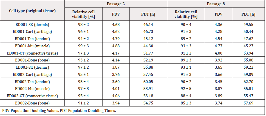 Whereas TI is the total incubation time expressed in hours from the time of seeding to the time of initiation of the harvest procedure and PDV is the population doubling value determined for the specific considered expansion. To assess stability of the equine cell banks during cryopreservation, the experiments were repeated after eight years of storage, whereas experiments were conducted in triplicate with three experimental repetitions.
