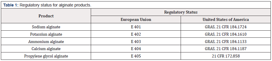 Alginates in Food Industry: The most common applications of alginates are based on their gel-forming ability. Their properties make them quite suitable in the field of food and beverages [36]. They are completely organic and for this reason they are considered as safe substances for food applications [36]. Thus, alginates are widely used as food additives in jams and jellies, to improve and stabilize the structure of food [37]. They are capable of thickening a solution, whenever they are dissolved in water and they have the ability to form either gels whenever they are added to a calcium salt solution or sodium or calcium alginate films and calcium alginate fibers [10]. For the aforementioned reasons, alginates are used as enhancers of viscosity, stability and for emulsifying solutions, to enhance food preservation, improve flavor, taste, and appearance of the food [36]. For safety reasons, in Europe, regulations assign each additive a unique number, the well-known “E numbers,” for each and every approved additive [38]. The regulatory status of alginic acid products, which are widely known as E 401, E 402, E 403, E 404, and E 405, in dietary supplements, is summarized in Table 1.