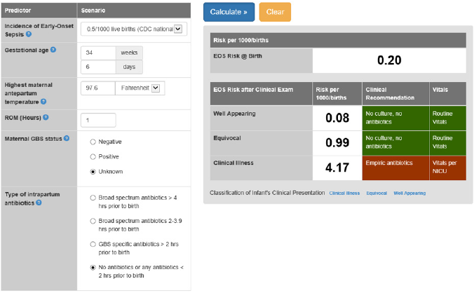 Infant was born at 40 4/7 weeks, maternal temperature was 100.5 °F, rupture of membrane was 8 hours, negative maternal group B streptococcus (GBS) screen, intrapartum antibiotics were given < 2 hours. Initial assessment/calculation by EOS calculator at birth shows the risk to be 0.31, ‘no culture, no antibiotics. Complete blood count (CBC) obtained twice were normal, C-Reactive Protein was < 0.27. Infant was weaned off oxygen in < 2 hours. No antibiotics were started. Infant was transferred back to the nursery.