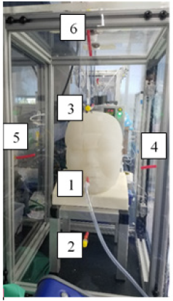 A custom-built surrogate adult head, with human face morphology and realistic nasal and oral cavities, was placed inside an approximately 1’ x 1’ x 2’ airtight containment box for the aerosolization tests.