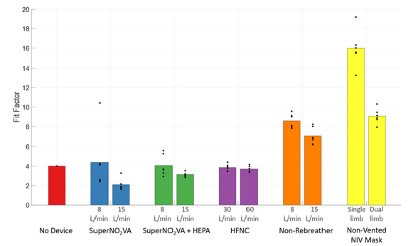 Results: Fit Factor between devices significantly differed (P<0.0001) but not between Normal Breathing and Coughing (P=0.15). SuperNO2VA with HEPA (N) and NV-NIV Mask with single-limb circuit each had significantly larger FF compared to all other devices (P<0.005). SuperNO2VA without HEPA (N), Non-Rebreather, and NV-NIV Mask with dual-limb circuit had no significant differences between FFs (P=1.0). SuperNO2VA with HEPA (N/O), SuperNO2VA without HEPA (N/O), and HFNC had significantly lower FF than other devices (P<0.05).